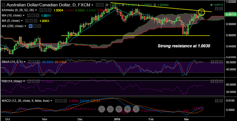 - On the upside we see strong resistance at 1.0030 (trendline) ahead of 1.0054 (Mar 9th highs).