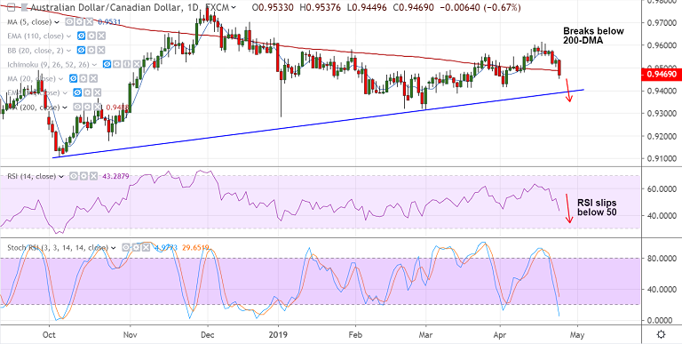 - The pair has broken below 200-DMA and is currently trading at 0.9475 at 0930 GMT, bias is bearish.