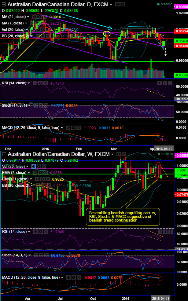 On weekly plotting, resembling bearish engulfing occurs, while RSI, Stochs & MACD suggestive of bearish trend continuation.