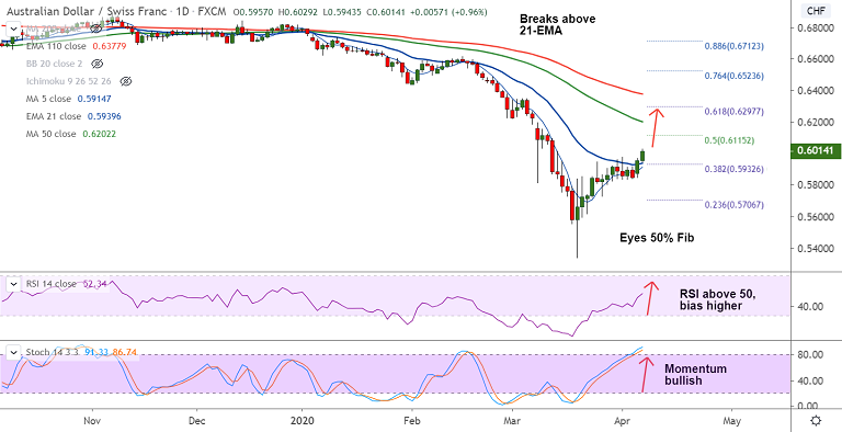 AUD/CHF spiked past 21-EMA and was trading 0.92% higher at 0.6011 at around 08:35 GMT.