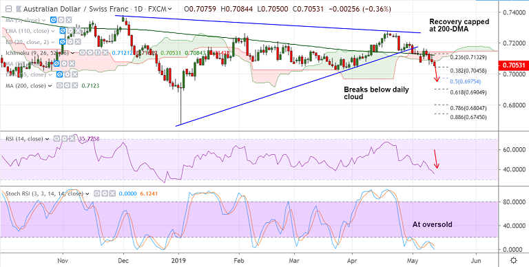 - Cloud top caps upside at 0.7084. Break above could see retrace till 200-DMA.