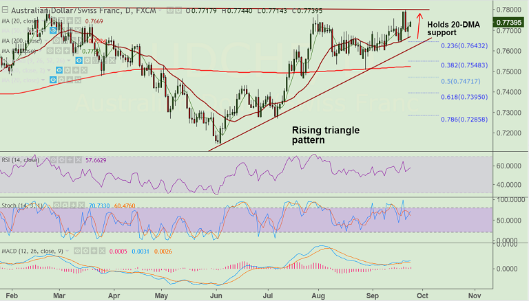 - The pair has taken support at 20-DMA and edged higher, scope for test of Triangle top at 0.78 levels.