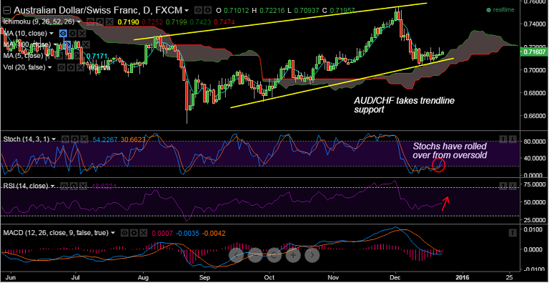 - AUD/CHF trading in a rising wedge formation, has taken trendline support and edged higher to trade at 0.7146.