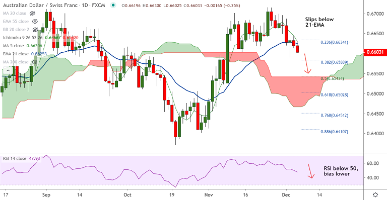 - Pair breaks below 21-EMA, upside remains capped at 5-DMA