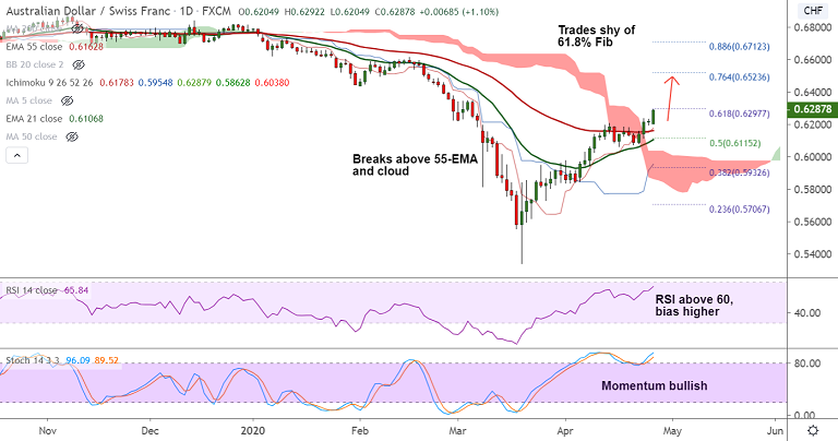 Price is extending breakout at 55-EMA and daily cloud, trades shy of 61.8% Fib at 0.6297.