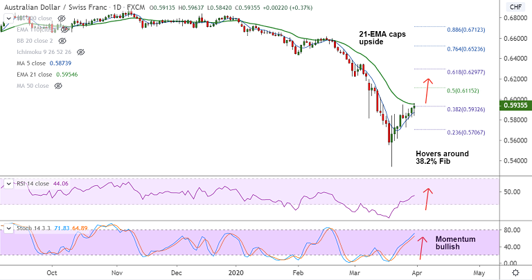 Next hurdle for bulls lies at 50% Fib at 0.6115 ahead of 55-EMA at 0.6218. Rejection at 21-EMA negates any bullish bias.