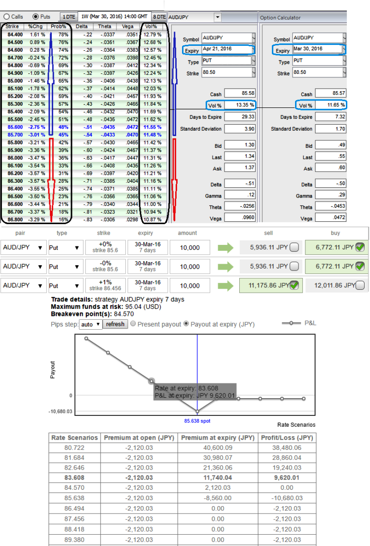 As we expect the underlying currency exchange rate of AUDJPY to make a larger move on the downside. As shown in the figure purchase 1M 2 lots of At-The-Money -0.52 delta puts and sell 1W one lot of (1%) In-The-Money put option with theta either closer to zero or positive .