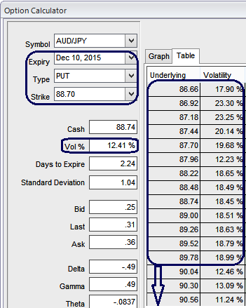As we expect the underlying currency exchange rate of AUDJPY to make a larger move on the downside. As shown in the figure purchase 3 lots of 1W At-The-Money -0.52 delta puts and simultaneously short 3D 2 lots of (1%) In-The-Money put option with positive theta.
