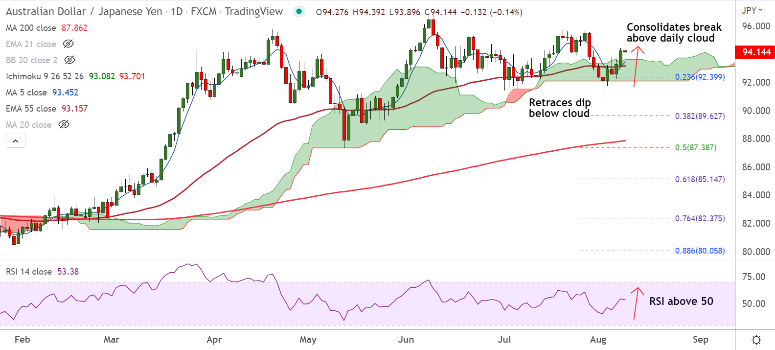 Summary: AUD/JPY is consolidating break above daily cloud. Technical indicators support upside in the pair. Bullish invalidation likely on retrace below cloud.