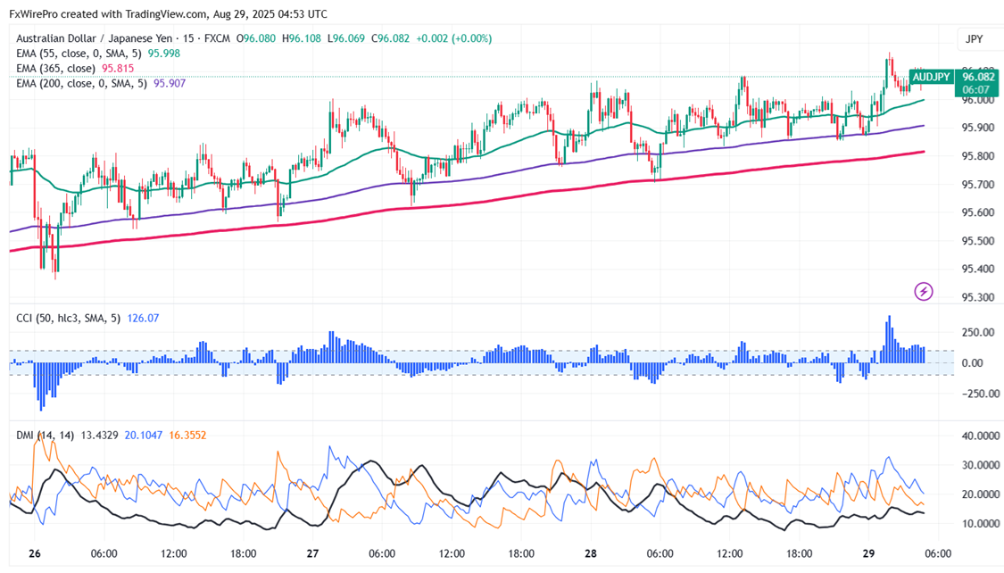 ‘The pair is trading above 55 and 200 EMA and below 365 EMA (long-term) on the 15-min chart, confirming a bullish trend. Any violation below 95.50 indicates the intraday trend is weak. A dip to 95/94.40/93.95/93 is possible. Immediate resistance is at 96.20, a breach above this level targets 96.50/96.85/97.20/97.64/98.