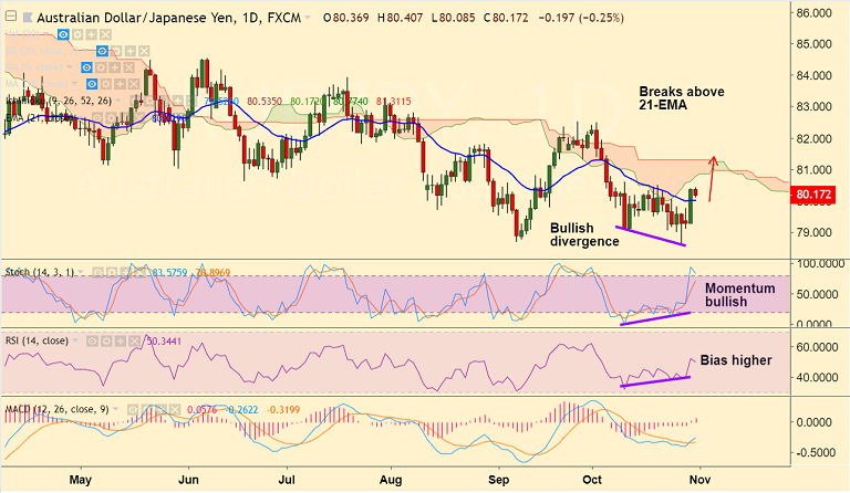 - AUD/JPY closes above 21-EMA resistance at 80.01