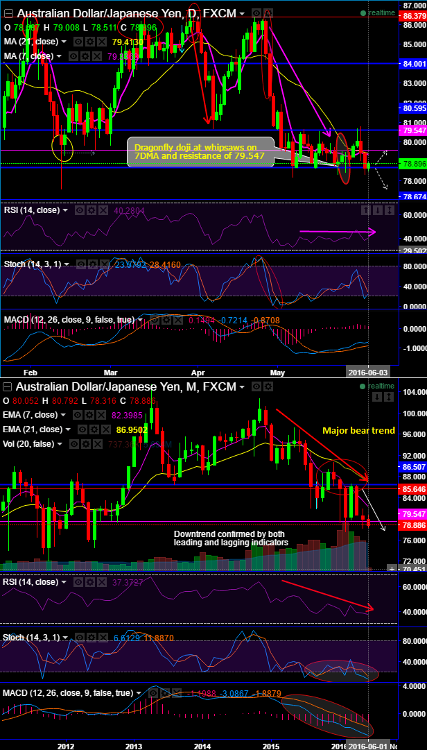 You can figure out from the monthly chart that the bears have managed to break supports at 79.547 levels, price remaining below EMAs consistently has been the evidence of the robust downtrend, to drop below 79.547 & EMA curves as the strong supply seen at this level for this pair.