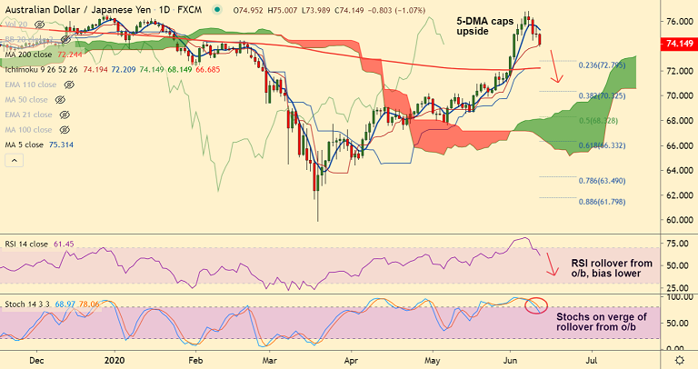 AUD/JPY has paused 4-day losing streak and was trading 0.83% higher at 73.86 at around 08:00 GMT.