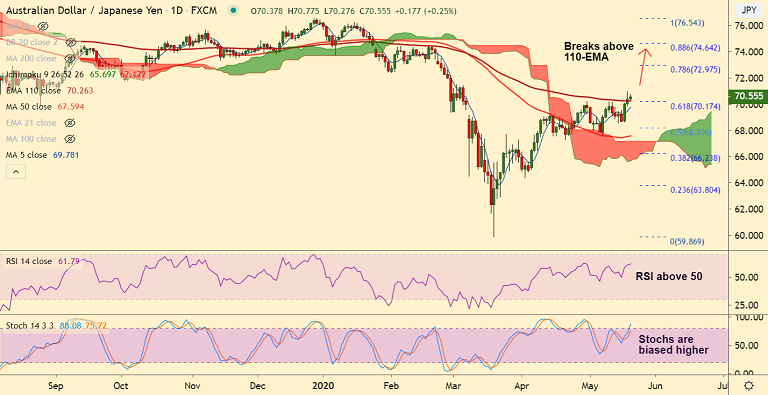 AUD/JPY has broken above 110-EMA resistance, raising scope for further upside.