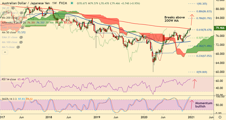 Summary: The pair trades with a major bullish bias. Close above 200W MA will buoy bulls. Scope then for test of 80.71 (Apr 2019 high). Next major resistance lies at 78.6% Fib at 83.79.
