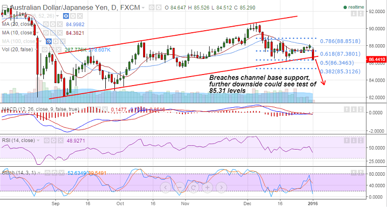 - AUD/JPY has broken below channel base support at 86.70 and is currently trading at 86.60, is down around 1.5 % on the session.