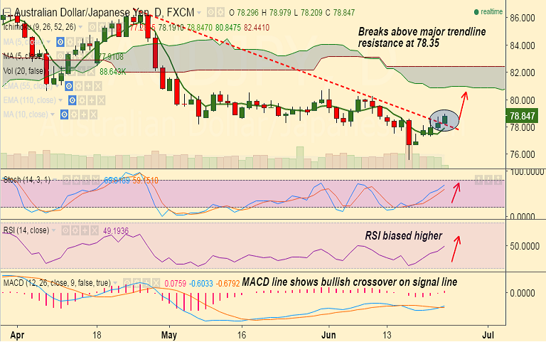 - AUD/JPY has edged lower after hitting highs of 78.98, has broken major trendline resistance at 78.35.