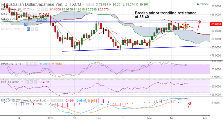 - Strong resistance for the pair is seen at 85.87 (Mar 17th high), breaks above can see upside till 86.35 levels.