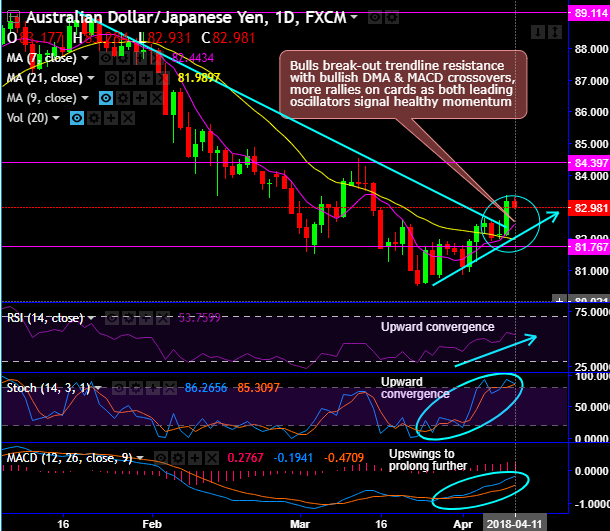 The minor trend of AUDJPY has spiked off above DMAs with bullish MACD and DMA crossovers with healthy momentum.