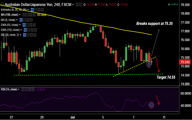 - On the 4-hourly charts. AUD/JPY has broken major trendline support at 75.35, bias lower.