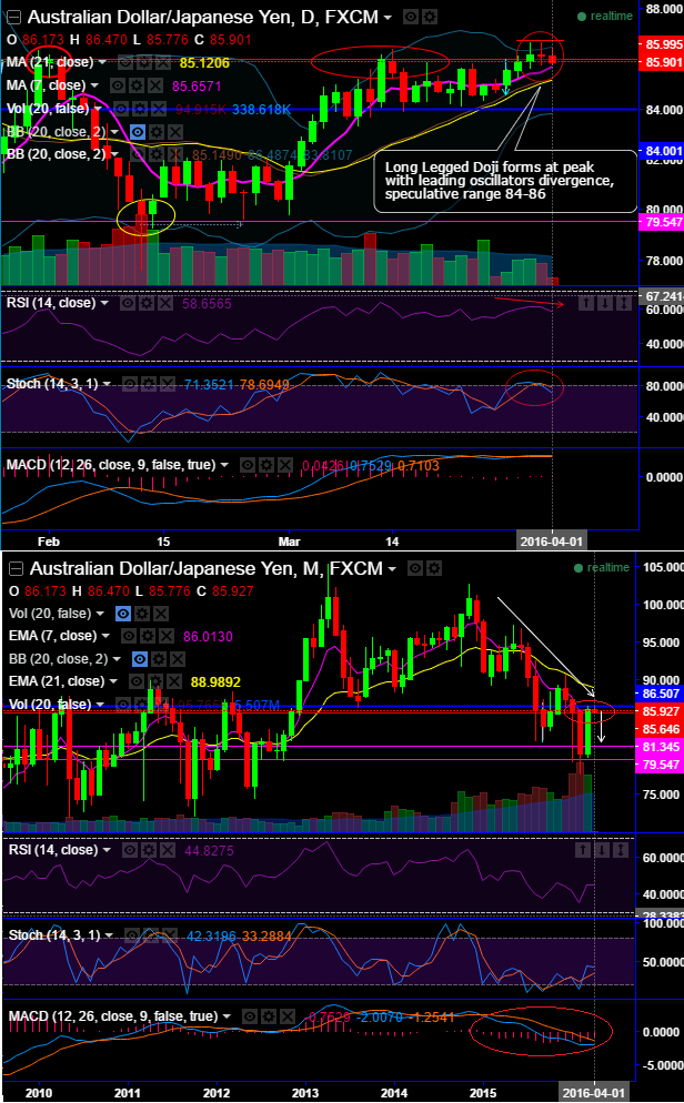 Long Legged Doji forms at peak of 86.173 levels with leading oscillators divergence, speculative range 84-86.700.