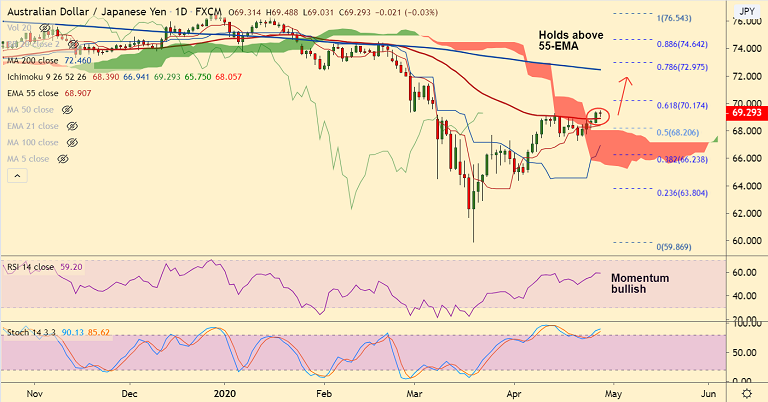Breakout above daily cloud and 55-EMA reinforces upside bias. The pair is on track to test 61.8% Fib at 70.17.