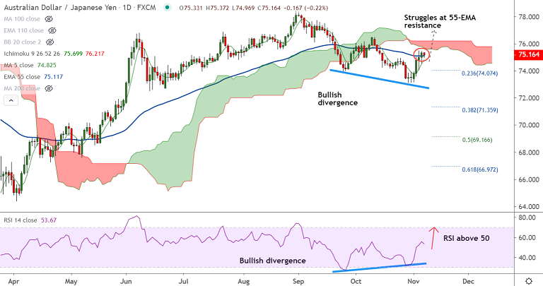A bullish 5-DMA crossover on 20-DMA also keeps scope for upside. Daily cloud is immediate resistance at 75.61.