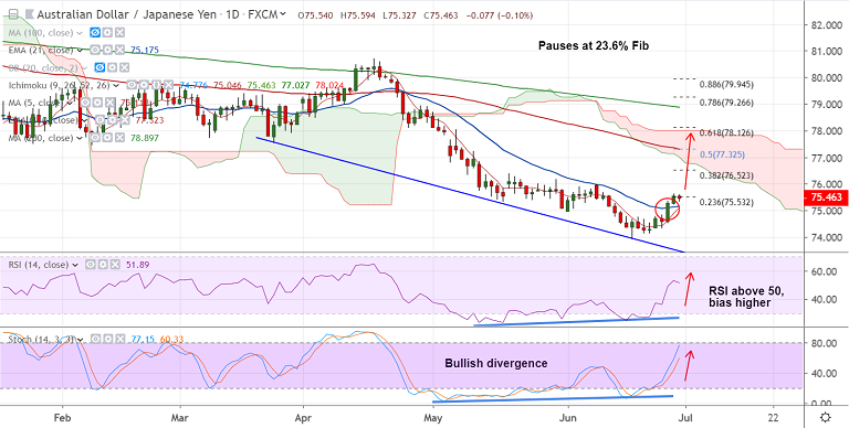 Immediate resistance is seen at 55-EMA at 76.20. Break above finds next major resistance at cloud bottom at 77.02.