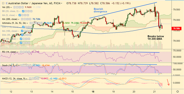 - Price action has dipped below 1H 200-SMA and cloud. We also evidence bearish divergence on the hourly charts.
