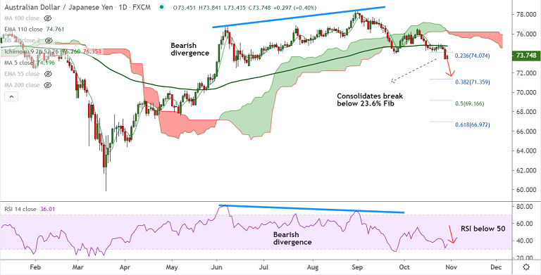 5-DMA is immediate resistance at 74.19. Break above will see minor upside. bearish invalidation only above daily cloud.