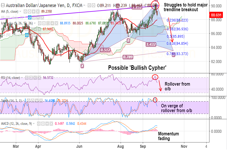 - Technicals on daily charts have turned bearish, RSI has rolled over from overbought levels and Stochs are on verge of rollover.