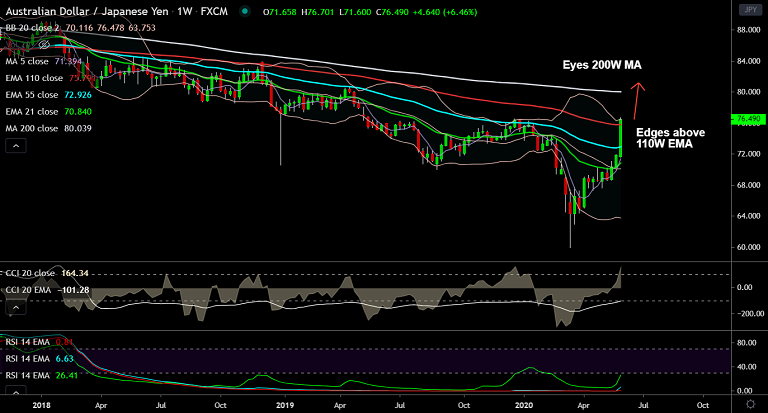 AUD/JPY was trading 0.88% higher on the day at 76.44 at around 12:30 GMT.