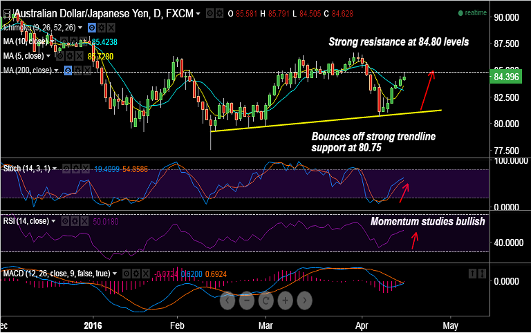 - AUD/JPY hit fresh nine-day highs of 84.77, and there is scope for test of 85 levels.