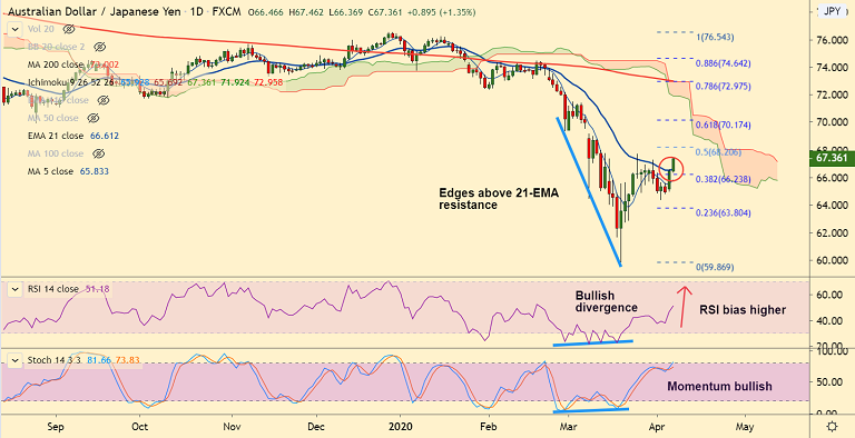 AUD/JPY was trading 1.39% higher on the day at 67.38 at around 08:00 GMT, bias is bullish.