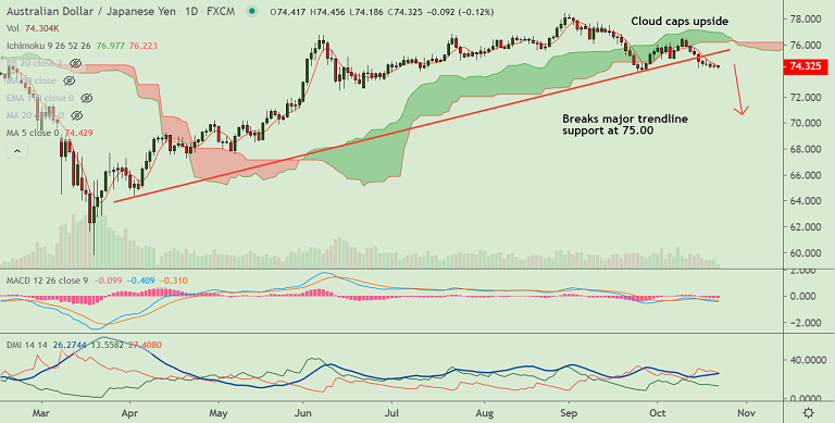 Summary: Aussie under pressure as RBA is widely expected to cut rates at its Nov meeting. Risk-off also weighs on the pair. Scope for downside resumption. 200-DMA in sight. Bearish invalidation only above daily cloud.