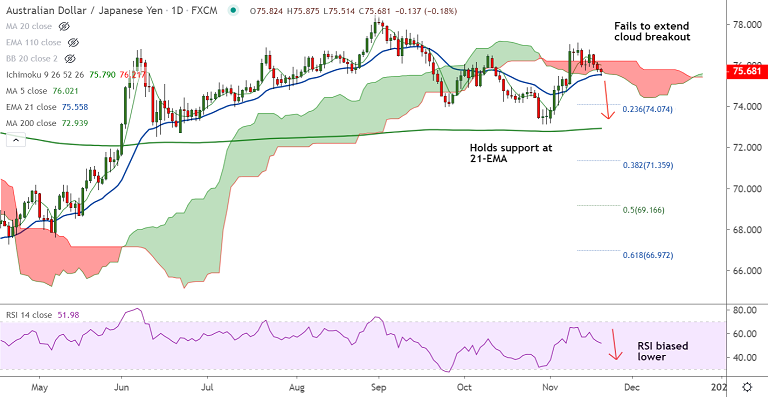 AUD/JPY was trading 0.19% lower on the day at 75.67 at around 10:50 GMT, bias remains bearish.