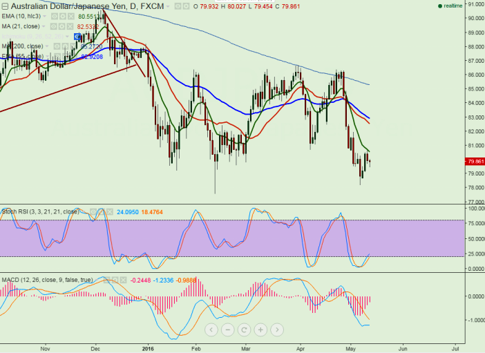 - AUD/JPY has jumped after making a low of 78.17 on May 6th 2016. But the upside has been capped by 10 day EMA .It is currently trading around 79.85.