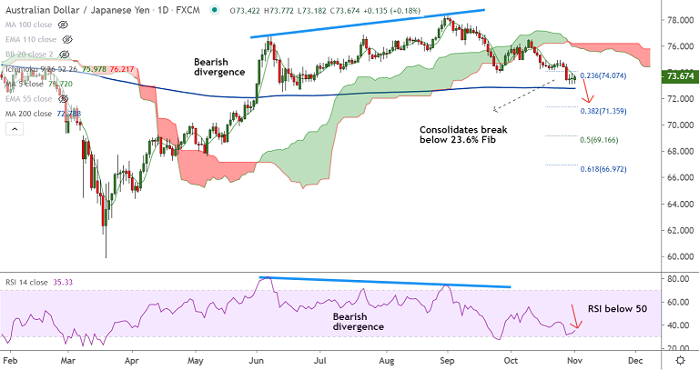 Summary: AUD/JPY is extending sideways grind above major 200-DMA support, and we see further weakness only on decisive break below. Focus now on RBA policy meet (Tuesday). Markets have priced in a rate cut to a record low of 0.1%. Any dovish surprise in the statement that follows may knock the Aussie lower. Watch out for break below 200-DMA for further downside. Next major support lies at 38.2% Fib at 71.35.