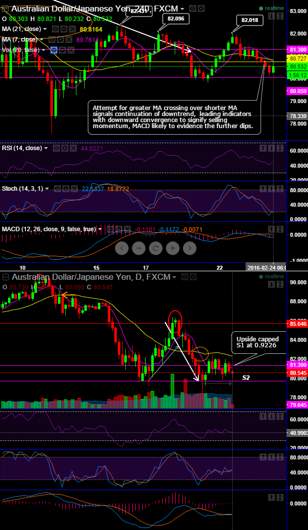 On intraday terms also it is lingering at resistance around 80.727 levels, that is where the attempt of 21MA crossing over 7MA and at this contraction the price has slid below moving average curves, as a result more weakness is anticipated in this pair at current stage.