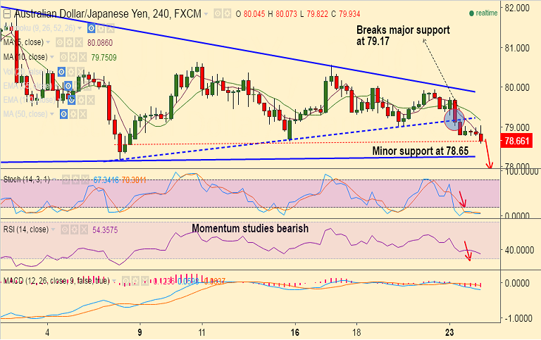 - AUD/JPY hit lows of 78.58 after breaking major support at 79.17 and is currently trade around 78.65 levels.