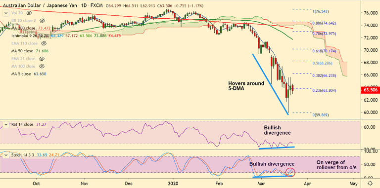 Major trend in the pair is bearish, but a 'bullish divergence' and 'oversold oscillators' hold scope for upside.