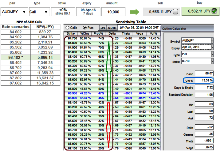 As we expect the underlying currency exchange rate of AUDJPY to make a larger move on the downside. As shown in the figure purchase 1M 2 lots of At-The-Money -0.52 delta puts and sell 1W one lot of (1%) In-The-Money put option.