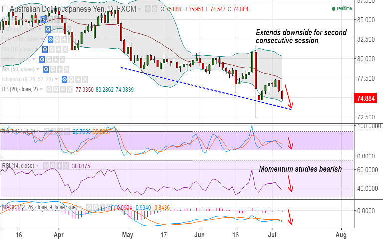 - The pair extends downside from Tuesday, hits lows of 74.55 before paring some losses to currently trade at around 47.85 levels.