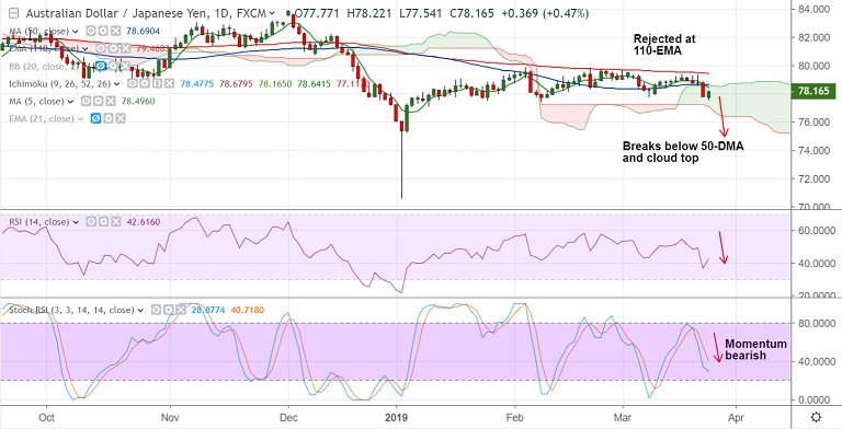 - Price action has slipped below 50-DMA and has broken into daily cloud.