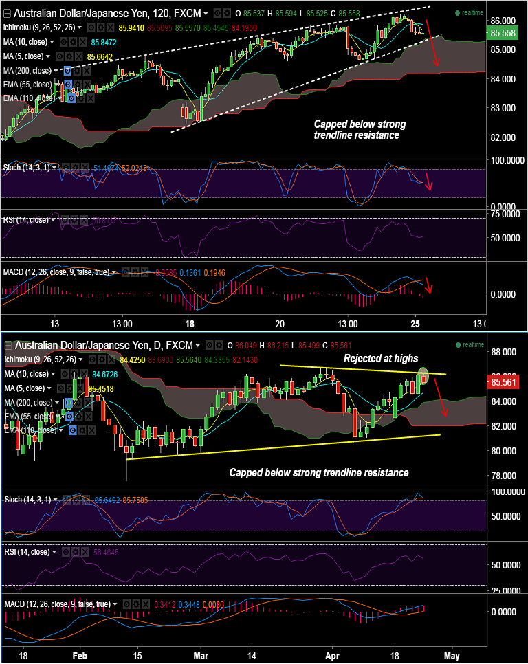 - AUD/JPY extended upside on negative yen fundamentals, but upside was capped at strong trendline resistance at 86.22.