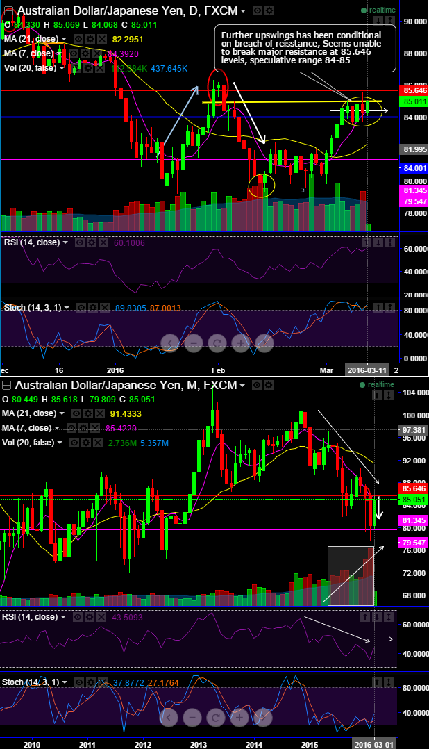During convincing rallies of AUDJPY bears pulled back at 85.623 (strong resistance at 85.645) but held firmly another minor resistance 85 levels on daily charts, so thereby bull rallies began on 1st Jan seeing weakness back again to signify long term bear trend's momentum.