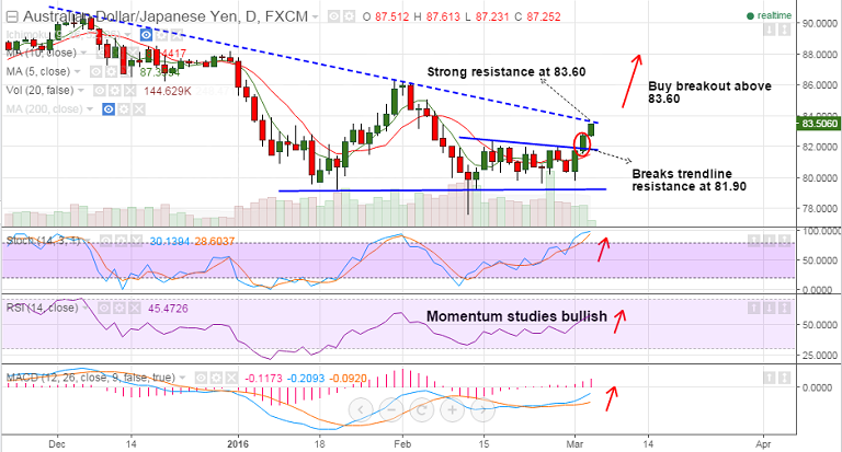 - AUD/JPY has broken above strong trendline resistance at 81.90 and is on track for test of major resistance at 83.60 levels.