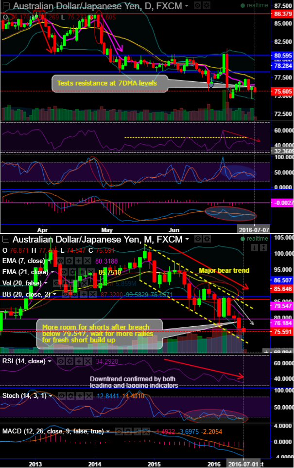 During the course of convincing rallies of AUDJPY, yesterday bears pulled back at 76.176 levels on daily charts (strong resistance at 7DMA), thereby, bears resume weakness back again to signify long term bear trend's momentum.
