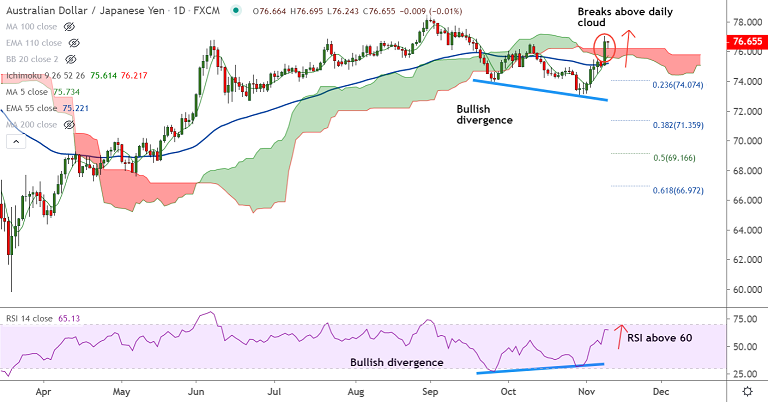 Summary: AUD/JPY is extending gains for the second straight week after pullback has bounced off 50W MA support. Risk-on environment on the back of breakthrough in the coronavirus vaccine keep the pair supported. Technical analysis also points to further gains. Scope for test of 200W MA at 79.42. Failure to hold above cloud will negate bullish bias.