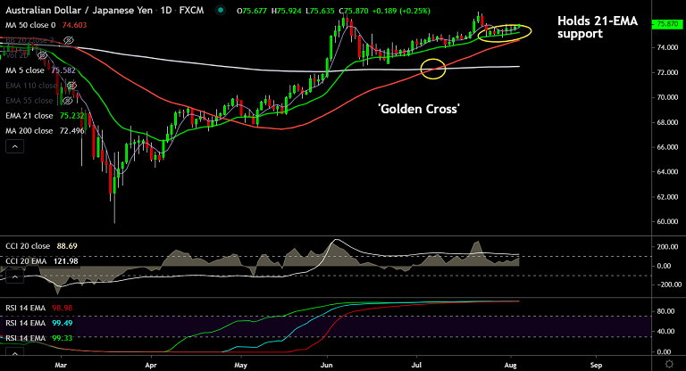 On the flipside, 21-EMA is strong support at 75.23. Break below will see dip till 50-DMA at 74.60. Bullish invalidation only below 200-DMA.